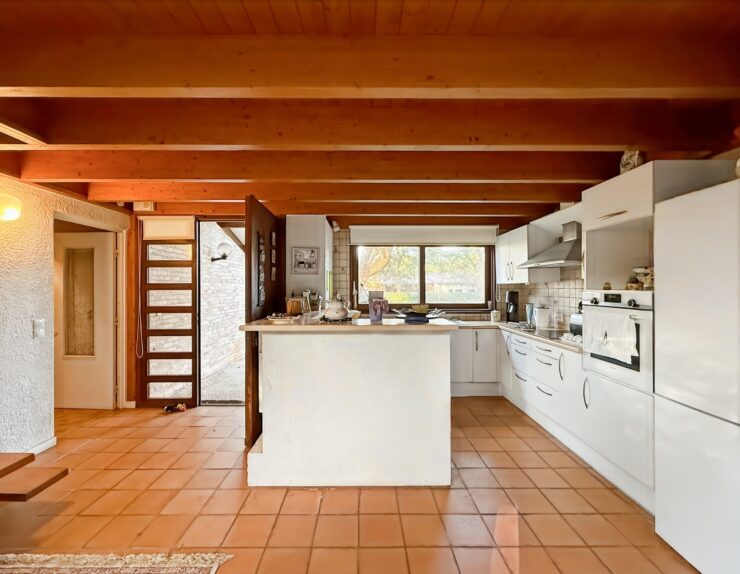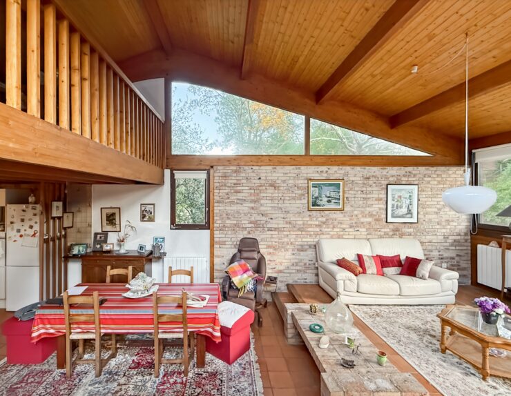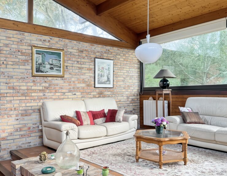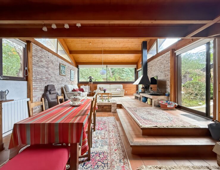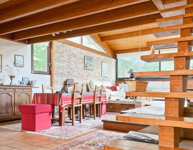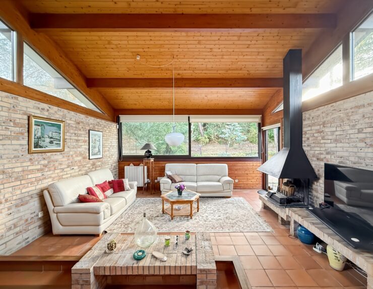 - Cœur de Vie : Une pièce de vie de 50 m² baignée de lumière grâce à ses larges baies vitrées. Le salon, avec sa cheminée fonctionnelle, s’ouvre sur le jardin et la piscine pour une sensation d’espace infini.