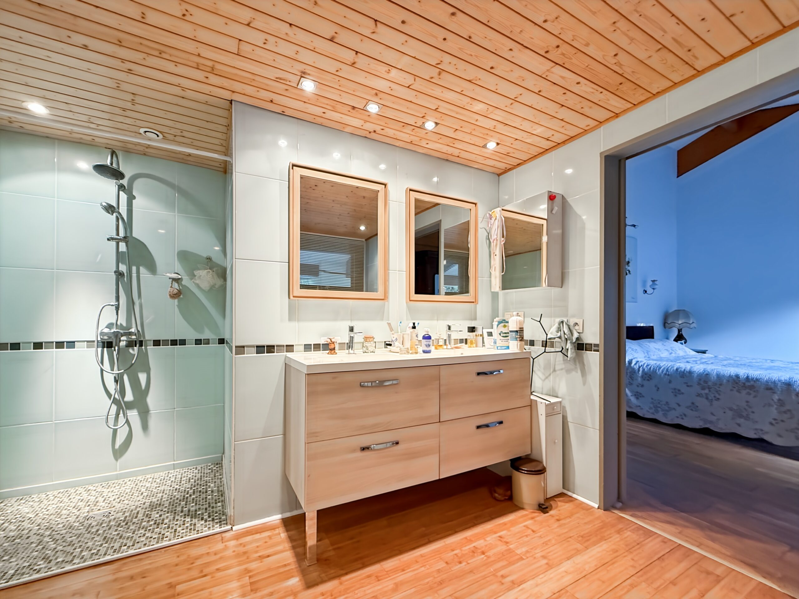 - Espace Nuit : Trois chambres confortables, dont une suite parentale avec salle de bain attenante (douche à l’italienne et double vasque) s’ouvrant directement sur la terrasse.