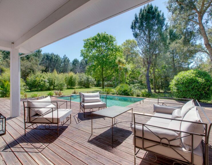 • Terrasse & Piscine : Une immense terrasse en bois de 170 m² entoure une piscine nichée au cœur d’une végétation luxuriante (essences locales et arbres matures).
