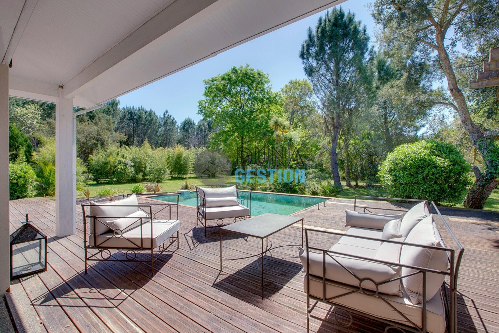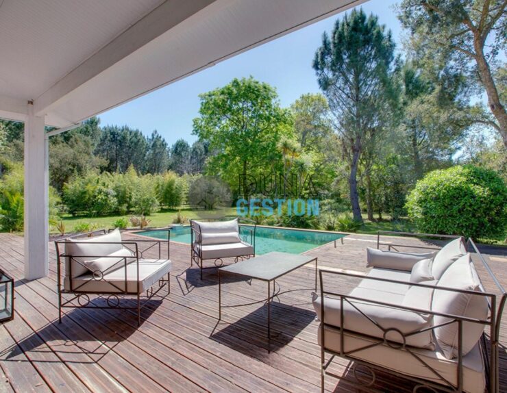 - Extérieurs et piscine : On vit surtout dehors ici. Il y a une terrasse en bois massive de 170 $m^2$ qui entoure la piscine. Le parc est planté d’essences locales et d’arbres matures, on est littéralement en lisière de forêt.