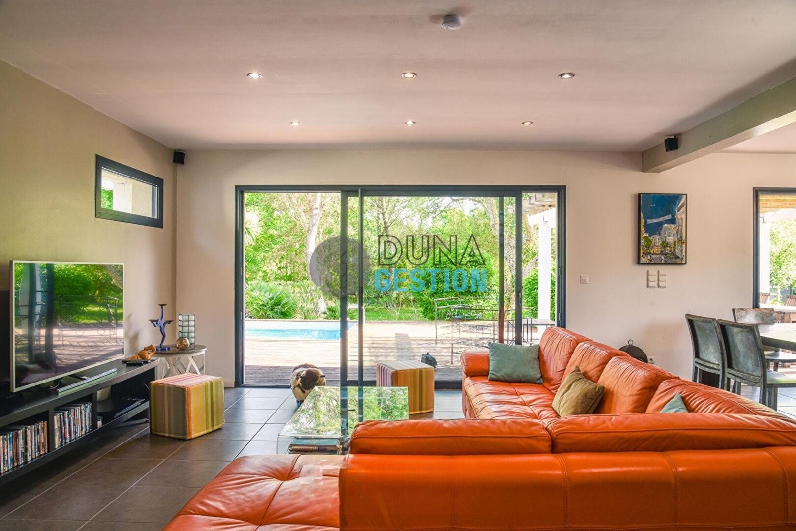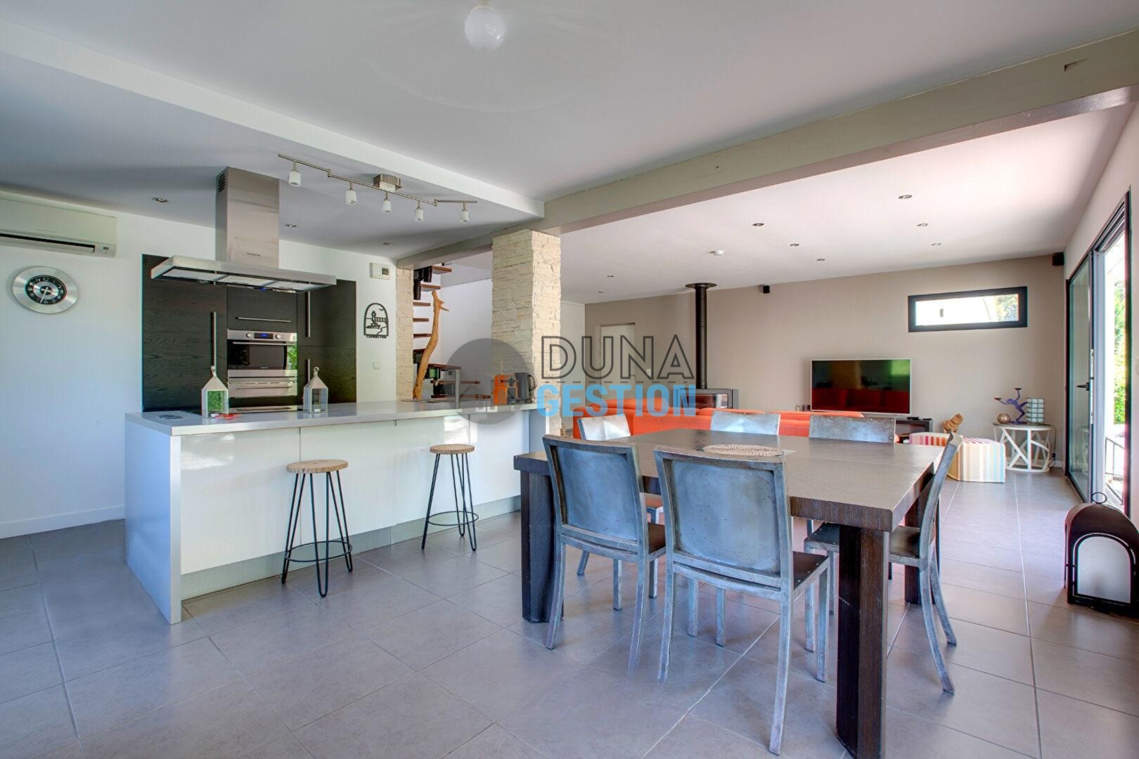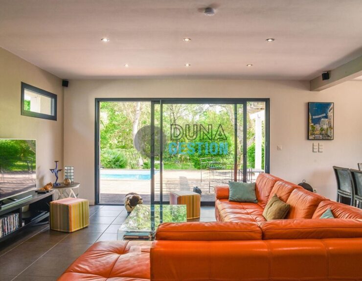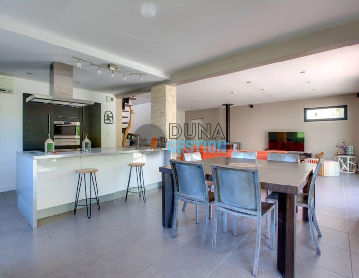 - L’espace de vie : Le salon est baigné de lumière grâce à d’énormes baies vitrées orientées plein sud. La cuisine est moderne, fonctionnelle et ouverte sur le séjour, ce qui est idéal pour les grandes tablées en vacances. Ce qui est super, c’est que toutes les pièces du rez-de-chaussée donnent directement sur la terrasse.